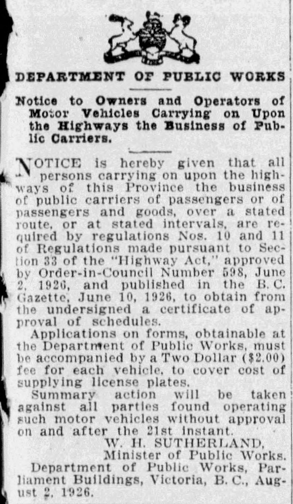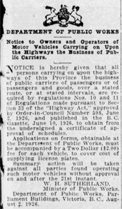 On August 2, 1926, the Department of Public Works issued a Notice alerting the operators of public carriers (bus companies) that the regulations adopted in June of that year by Order in Council would be required to obtain a "Certificate of Approval" from the Minister.