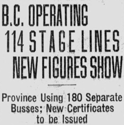 The Department was quoted as saying "motor transportation has become one of British Columbia's large business operations and a method of travel vital to most parts of the Province ... Almost all inhabited districts on the Coast and in the interior are using this method of transportation, which will show a big growth in 1928, it is expected."