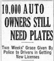 In the cartoon at left, a motorist is shown, first, with his 1929 license plate swearing he'll get his plates earlier in 1930. In 1930, he says he'll be earlier in 1931 and this is followed by a question mark for 1931.