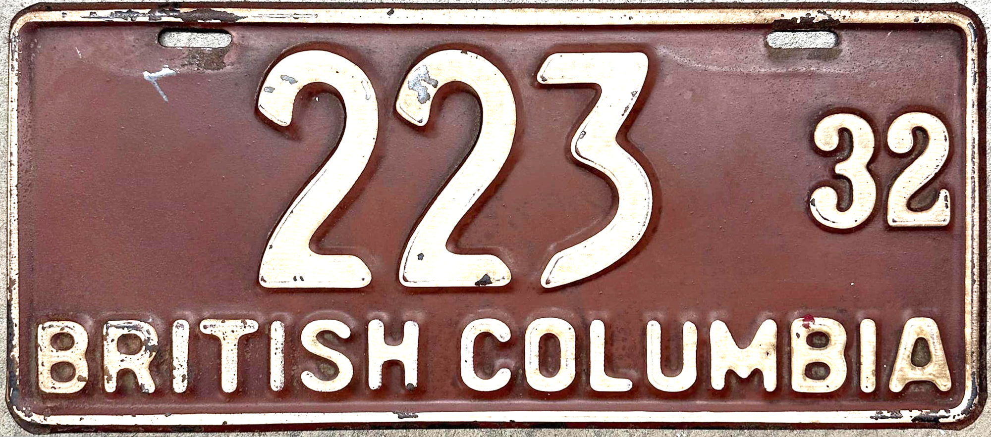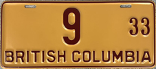 The 1933 license plates started arriving at the offices of the Motor Vehicle Branch in early October of 1932 with the colours described as "maroon figures against a background of buff". If you are curious like us, "Buff (latin bubalinus) is a light brownish yellow, ochreous colour ..." and describes the plates very accurately.