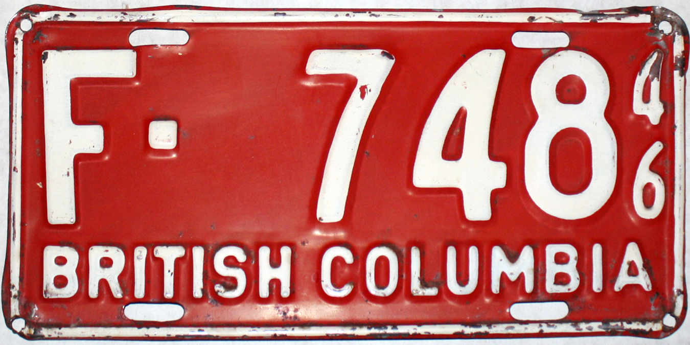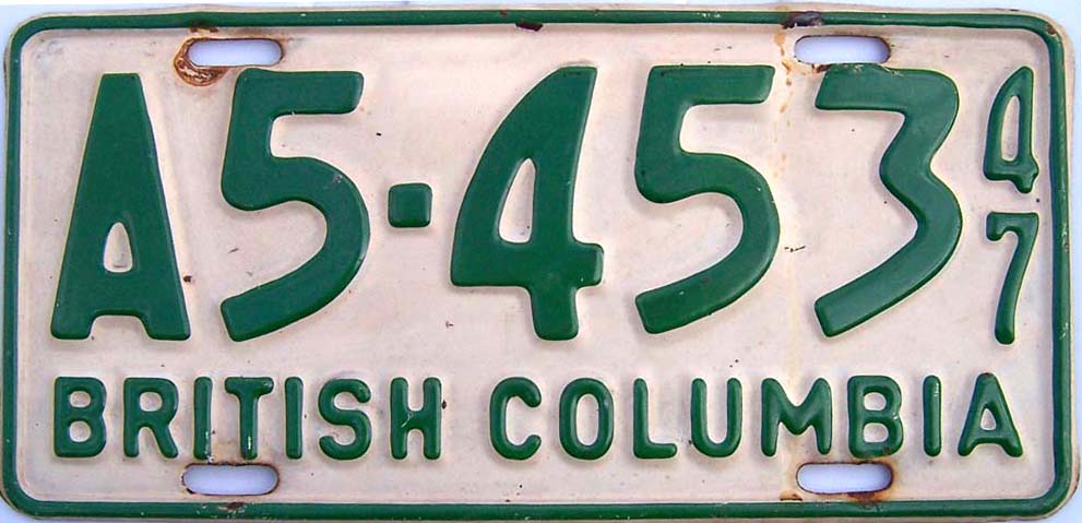 Formalizing the use of letter prefixes that had occurred at the end of 1940,George Hood, Inspector of the Provincial Police's Traffic Division, announced that cars being registered in Victoria & Island would receive plates starting with 'A', Vancouver cars would receive 'B' and New Westminster would receive 'F'.