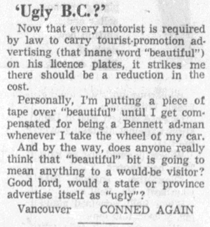Not surprisingly, given its 1962 Editorial (see above), the first to make hay out of the new slogan was the Vancouver Province newspaper and its columnist Eric Nicol, who, in mid-January of 1964, proclaimed it “plug ugly” (meaning extremely unattractive, or the opposite of “Beautiful”);