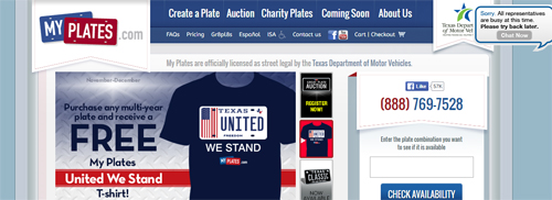 After finishing dead last in a survey of vanity license plates in North America conducted by the American Association of Motor Vehicle Administrators (AAMVA) in 2007, Texas privatised is vanity/specialty license plate program. The new vendor, MyPlates (an Australian company), overhauled the entire system brining in such obvious customer service improvements as on-line ordering and checking of slogan availability, new designs, auctions, 7 character slogans and variable pricing! Just check out that snazzy web page they have (at left)! |