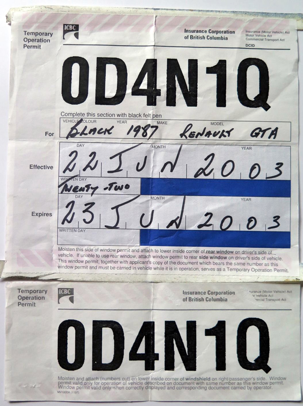 The more common occurrence is a car with expired plates displaying a paper Temporary Operating Permit in the back window with the smaller section of the permit displayed on the front windshield. In the photo shown above-left, the car has no license plates but the permit is visible at far left in the back window. At top-right is an example of both parts of a temporary permit: the top part goes in the back window while the bottom part (with only the serial showing) goes in the front windshield.
